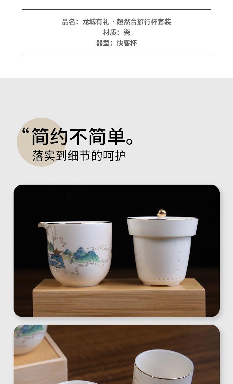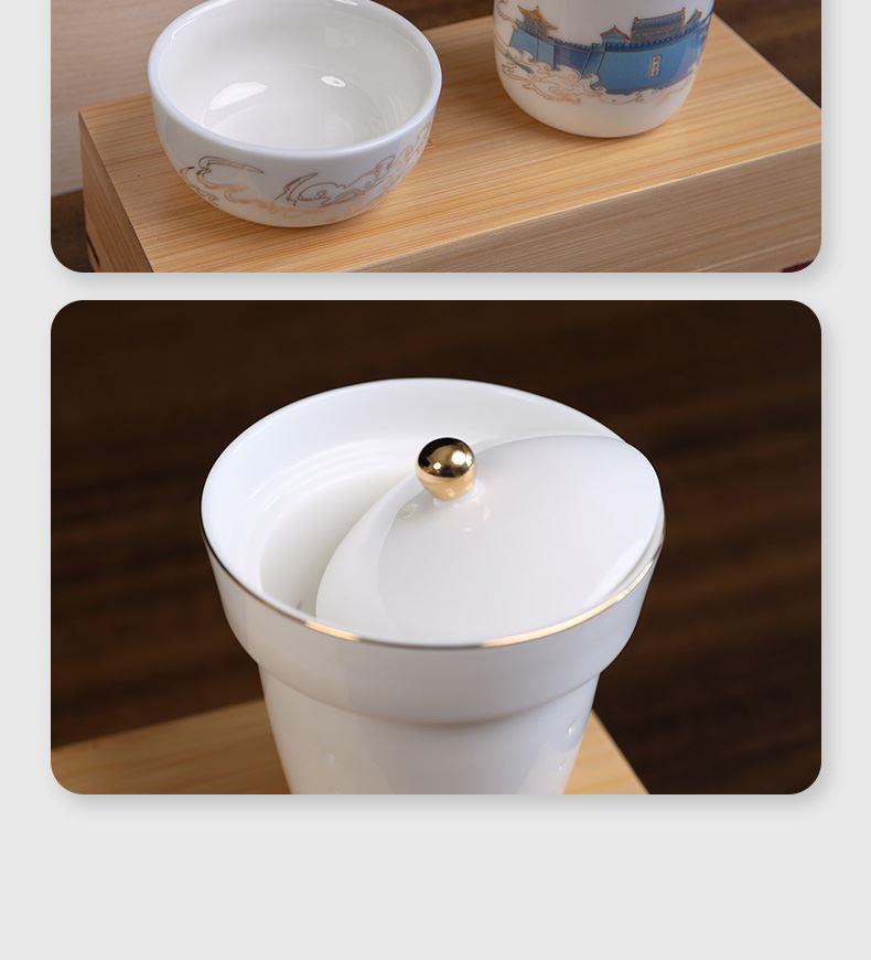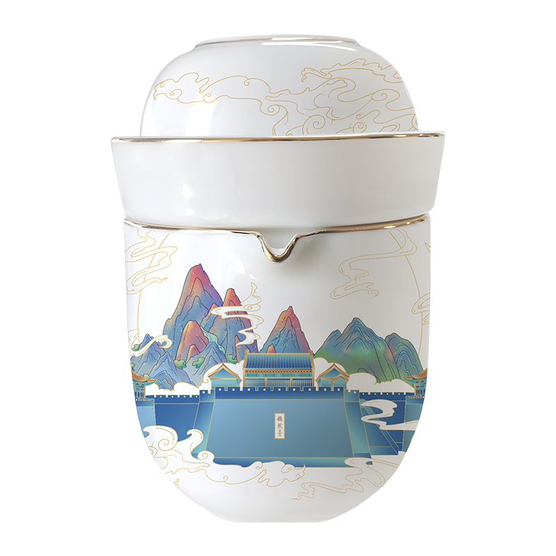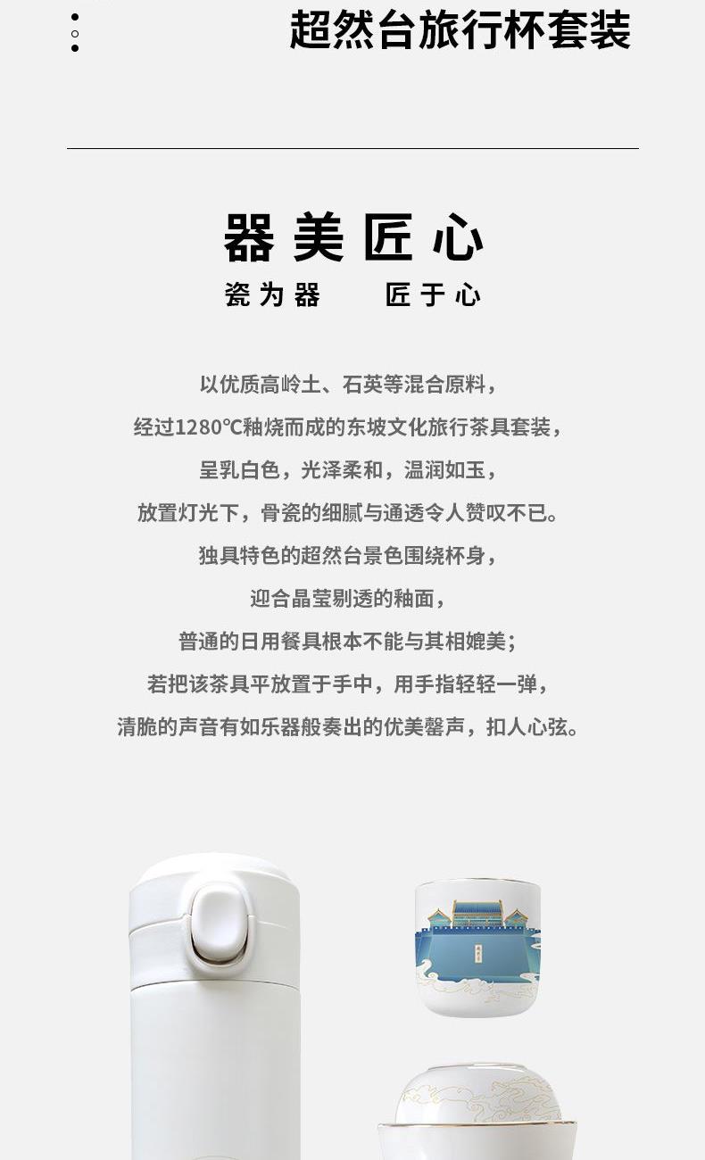 以优质高岭土、石英等混合原料,经过1280℃釉烧而成的东坡文化旅行茶具套装,呈乳白色,光泽柔和,温润如玉,放置灯光下,骨瓷的细腻与通透令人赞叹不已。独具特色的超然台景色围绕杯身,迎合晶莹剔透的釉面,普通的日用餐具根本不能与其相媲美;若把该茶具平放置于手中,用手指轻轻一弹,清脆的声音有如乐器般奏出的优美罄声,扣人心弦。